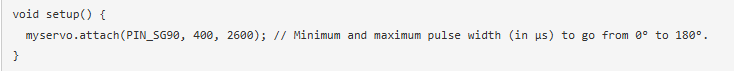 在Setup()函數(shù)中,給定伺服連接到板上的信號引腳細(xì)節(jié)到attach()函數(shù)到對象myservo。我已經(jīng)將伺服的信號引腳連接到Pico板的GP-0引腳上。此外,attach()函數(shù)用于指定引腳和以微秒為單位的最小和最大脈沖寬度值,以便將伺服器從0°旋轉(zhuǎn)到180°。在這種情況下,最小脈寬設(shè)置為400μs,最大脈寬設(shè)置為2600μs。