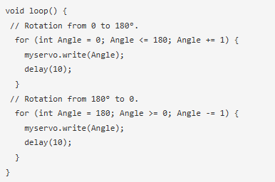 總的來說,代碼將連續(xù)地在0°和180°之間來回旋轉(zhuǎn)伺服電機(jī),每一步之間的延遲為10毫秒。