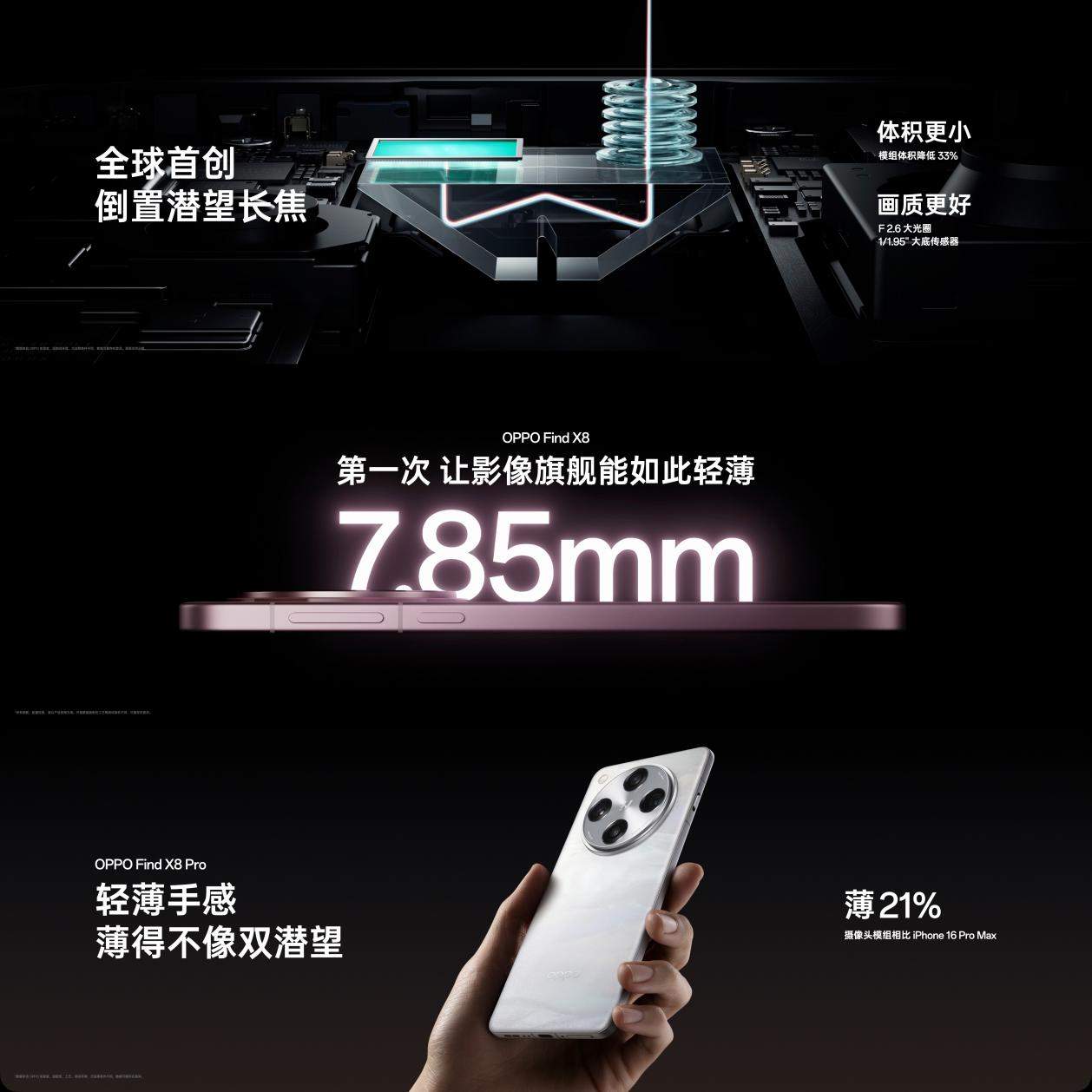OPPO Find X8系列首次將超輕薄直屏設(shè)計(jì)帶入影像旗艦,通過(guò)OPPO冰川電池的技術(shù)創(chuàng)新,以及全球首個(gè)倒置潛望長(zhǎng)焦采用的“不可能”的光路設(shè)計(jì),為Find X8帶來(lái)薄至7.85mm,輕至193g的超輕薄機(jī)身。創(chuàng)新性采用芯片級(jí)屏幕封裝技術(shù),F(xiàn)ind X8實(shí)現(xiàn)1.45mm的極窄邊框,將小直屏的手感與6.59”的大屏視覺(jué)體驗(yàn)完美平衡。6.78”大屏的Find X8 Pro采用等深四微曲的設(shè)計(jì),配合薄至 8.24mm 、輕至215g的機(jī)身,為用戶帶來(lái)絕佳手感。