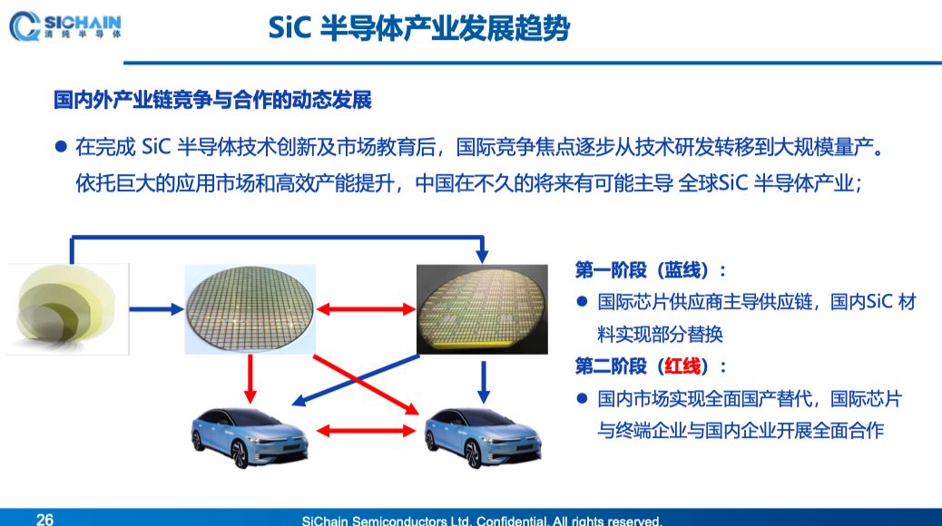 清純半導(dǎo)體將產(chǎn)業(yè)發(fā)展劃分為兩個階段:第一階段是國際芯片供應(yīng)商主導(dǎo)供應(yīng)鏈,國內(nèi)實(shí)現(xiàn)部分SiC材料替代;第二階段是國內(nèi)實(shí)現(xiàn)全面國產(chǎn)替代,國際芯片和終端企業(yè)與國內(nèi)企業(yè)展開深度合作。這一趨勢代表了國內(nèi)SiC產(chǎn)業(yè)的逐步自主化進(jìn)程。