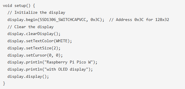 此外,還創(chuàng)建了Adafruit_SSD1306類的構(gòu)造函數(shù),以與名為“display”的OLED顯示器進(jìn)行交互,其參數(shù)是顯示寬度(128)像素和高度(64)像素。第三個(gè)參數(shù)也可以傳遞給構(gòu)造函數(shù),這是重置引腳編號(hào),但由于我們的OLED模塊沒(méi)有任何重置引腳終端,因此我們沒(méi)有使用該參數(shù)。