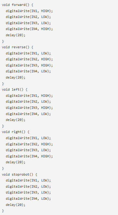 運動函數(shù):我們已經(jīng)定義了四種類型的運動函數(shù)和一個停止函數(shù)。配置四個數(shù)字引腳(IN1, IN2, IN3, IN4)將控制所有方向的移動。提供高-低指令對于轉(zhuǎn)動輪子至關(guān)重要。有時開發(fā)人員必須根據(jù)他們的硬件連接調(diào)整這些命令來設(shè)置True方向。