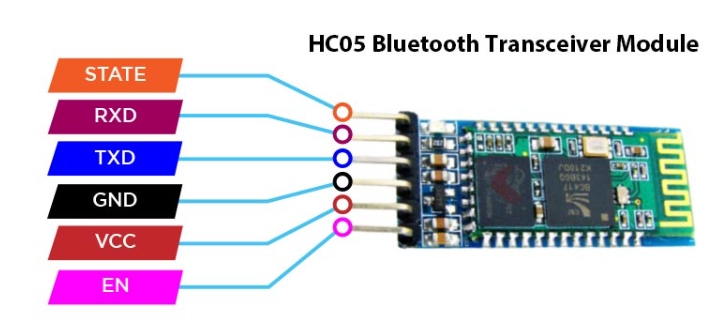 它由6個引腳組成,分別是STATE, RXD, TXD, GND, VCC和EN,如模塊背面所述。