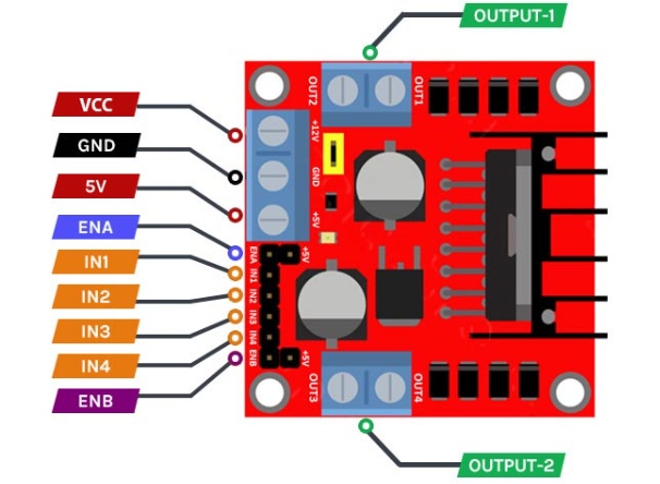 OUT-1 & OUT-2:該引腳用于連接電機。一個電機連接到OUT-1,另一個連接到OUT-2。您可以將電機連接到5v至35v的電壓范圍。請記住,無論施加到VCC的電壓是多少,您都會得到大約2伏的衰減。