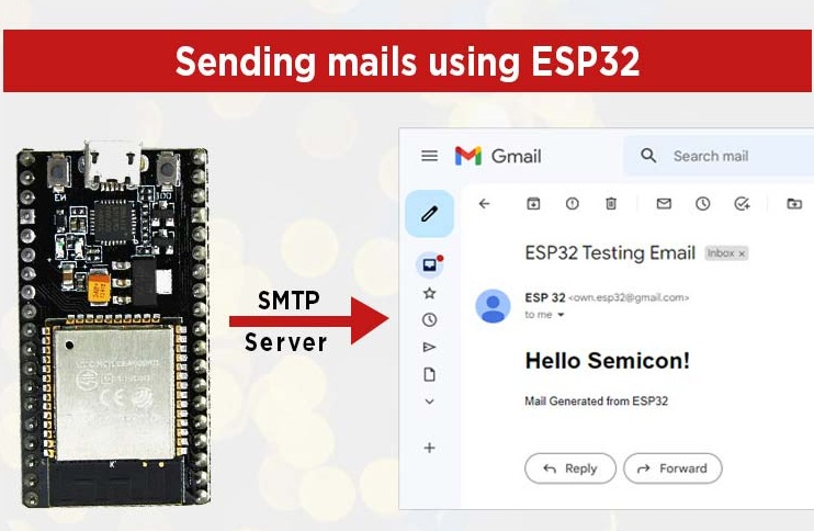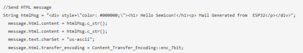 以上代碼行定義了HTML文本主體。對于標(biāo)題,我們指定‘ Hello Semicon ’。下一行將包含“從ESP32生成的郵件”。此消息顯示給發(fā)件人將是黑色的,因為我們已經(jīng)指定了十六進(jìn)制代碼。您可以根據(jù)自己的喜好添加自己的HTML文本和設(shè)置。