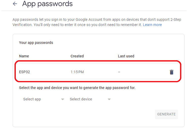 要使用ESP32發(fā)送電子郵件,請在您的Gmail帳戶中為不支持兩步驗證的應(yīng)用程序或設(shè)備生成唯一的應(yīng)用程序密碼。在這些設(shè)備上,應(yīng)用程序密碼可以代替常規(guī)密碼訪問Gmail。這些密碼可以從Google帳戶安全設(shè)置中撤銷,并且僅對指定的應(yīng)用程序或設(shè)備有效。