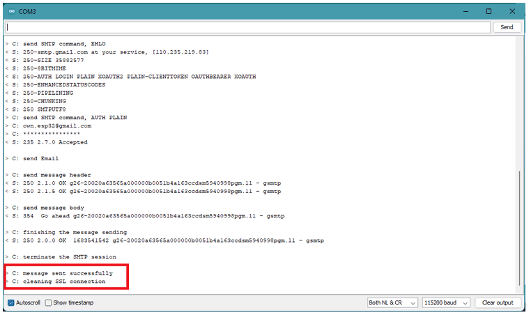 最后,如果一切正常,將顯示一條成功發(fā)送的消息。檢查您的電子郵件ID上的郵件。當(dāng)你啟動設(shè)備時,會發(fā)送一封電子郵件。