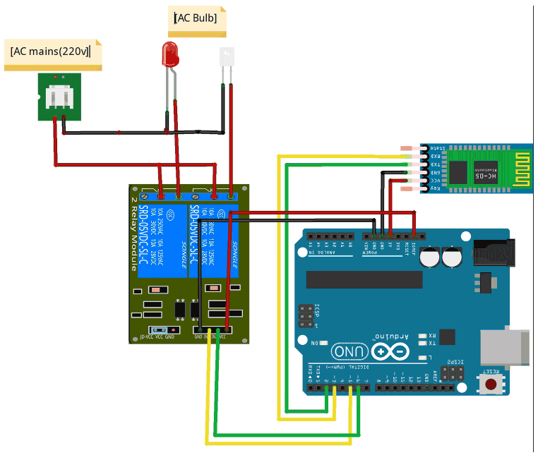在繼電器模塊的高壓側(cè),兩個繼電器的COM口都連接到交流電源上。每個繼電器的NO端子分別連接到每個單獨的燈泡上,中性線直接連接到兩個燈泡上,如圖所示。