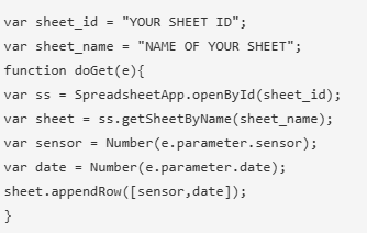 現(xiàn)在我們的Google表單已經設置好了,讓我們創(chuàng)建一個Google應用程序腳本。這個腳本將使我們能夠將數(shù)據(jù)從ESP推送到Google表。要創(chuàng)建Google腳本,請轉到Extensions -> Apps script(以前這個選項在Tools -> script Editor下)。然后將以下代碼復制粘貼到其中。