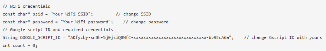 在WiFi憑據(jù)區(qū)域,用您自己的WiFi SSID和密碼填充它。在GOOGLE_SCRIPT_ID中添加您的Google Script ID,我們在部署腳本時已經復制了該ID。