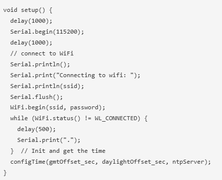 setup()函數(shù)將初始化串行通信,并使用我們已經添加的憑據(jù)建立WiFi連接。它還將初始化一個名為configTime的實例,用于從NTP服務器獲取時間。