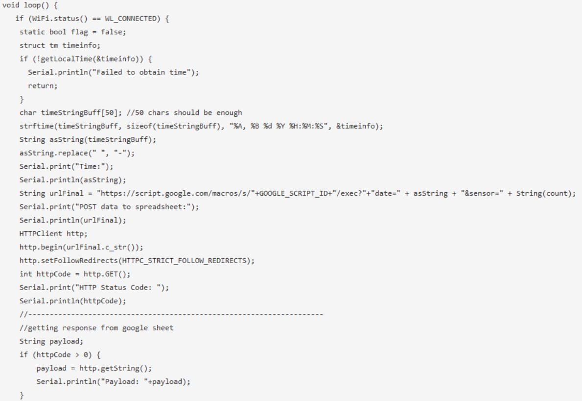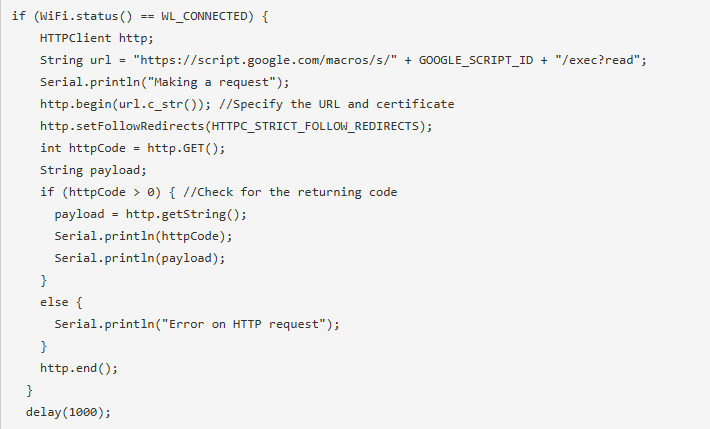 WiFi設置和一切都與第一個例子相似。因此,讓我們來討論一下Loop函數(shù),在這個函數(shù)中ESP32如何從Google Sheets請求數(shù)據(jù)。