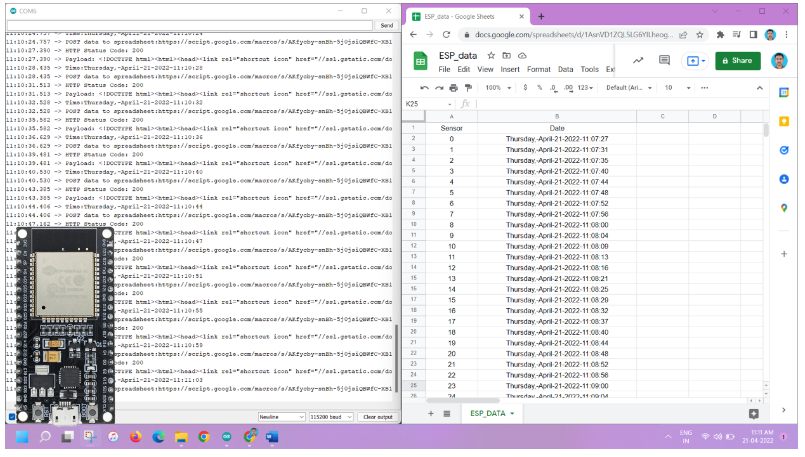 現(xiàn)在我們來看看循環(huán)函數(shù)。在loop功能中,如果WiFi連接處于活動狀態(tài),ESP32將從NTP服務器獲取時間。然后,它將組裝這個抓取的時間信息和變量計數(shù)的值到一個URL與谷歌腳本ID。之后,ESP32將在HTPPClient庫的幫助下建立到該URL的HTTP連接。一旦連接建立,ESP32將打印出HTTP狀態(tài)碼。同時,Google Scripts將從這個HTTP請求中獲取數(shù)據(jù),并將數(shù)據(jù)POST到Google Sheets中。然后增加一秒的延遲并增加計數(shù)。該過程將重復,時間和變量值將被張貼到谷歌表連續(xù)。通過這種方法,我們可以將任意數(shù)量的數(shù)據(jù)記錄到google表格中。這是谷歌表格和串行監(jiān)視器的實時視圖。