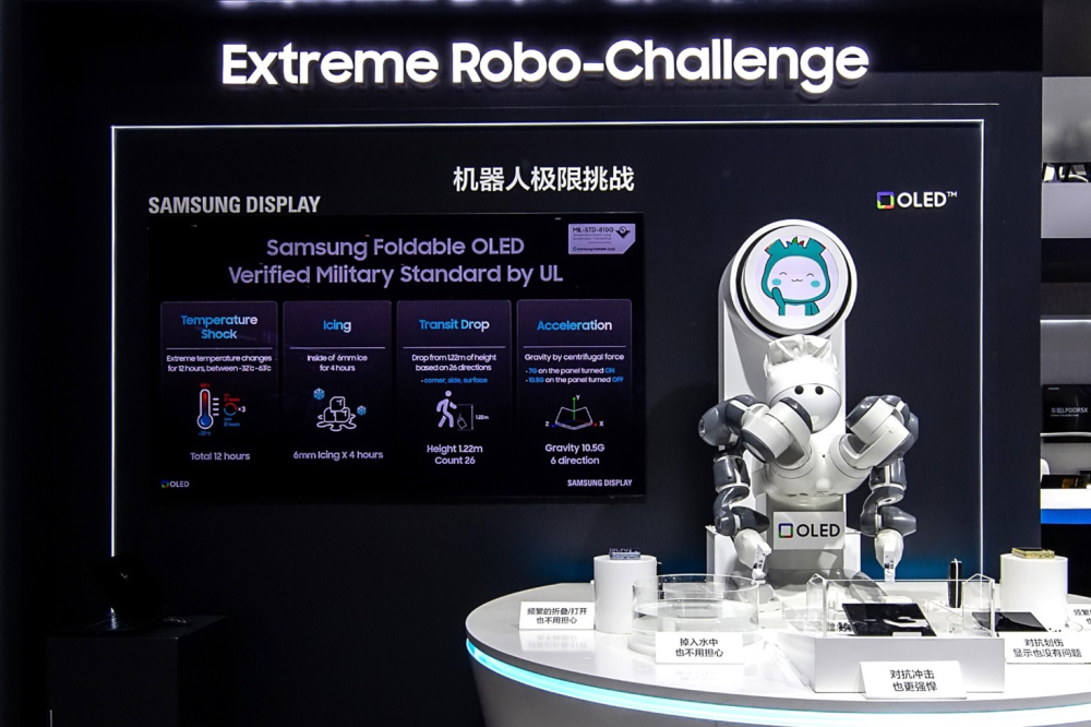 三星在追求產(chǎn)品卓越品質(zhì)的道路上,從不懈怠。為了打造高品質(zhì)產(chǎn)品,三星對旗下產(chǎn)品進(jìn)行了各項嚴(yán)苛的測試。為了直觀展現(xiàn)其對產(chǎn)品品質(zhì)的高標(biāo)準(zhǔn)嚴(yán)要求,三星特地將應(yīng)用于OLED生產(chǎn)線的“OLED Bot”帶到展會現(xiàn)場,通過機(jī)器人表演,將可折疊屏放入裝滿水的容器進(jìn)行防水測試,并通過撒鹽、撒胡椒粉、用鐵刷球摩擦等方式進(jìn)行劃痕測試,展示三星折疊屏獨(dú)有的強(qiáng)悍耐久性。