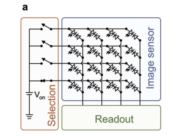 光電探測器crossbar陣列的特性:對于靜態(tài)成像,該陣列通過多通道掃描系統(tǒng)進行了測試。Keithley 3706A開關卡(Keithley 3730矩陣卡)用于選擇行和列以確定要測試的像素,Keithley 2612B源表用于測量電流與電壓特性。