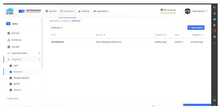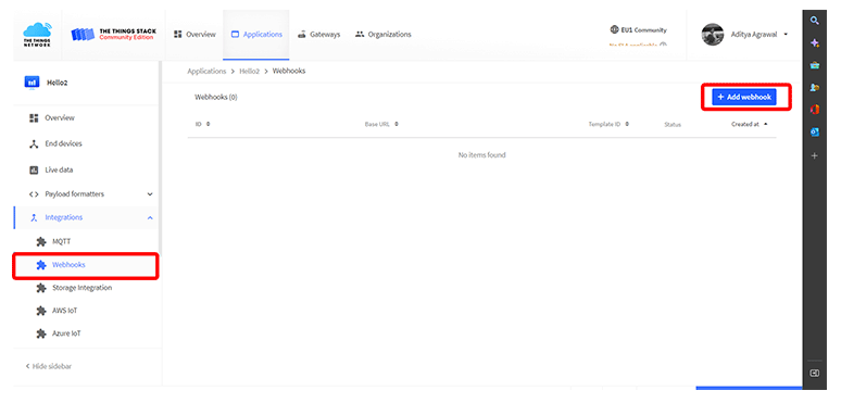 打開TTN應(yīng)用程序,在集成面板上選擇Webhooks。然后點擊添加Webhook按鈕。