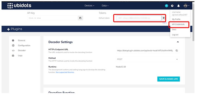 點擊Save & Make Live按鈕。在轉(zhuǎn)移到TTN之前,我們在Ubidots方面的集成現(xiàn)在已經(jīng)準(zhǔn)備好了。我們需要單擊配置文件菜單上的API憑據(jù)選項并復(fù)制默認(rèn)令牌。這將在稍后使用。