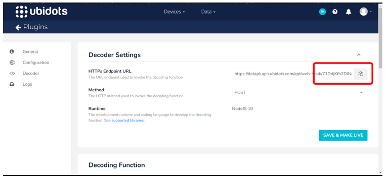 在解碼器設(shè)置下,我們有HTTPs端點URL,這是我們將配置TTN服務(wù)器發(fā)送數(shù)據(jù)包的URL,并復(fù)制插件ID,即/api/webhook/部分之后的URL部分。