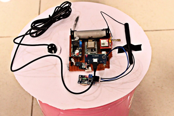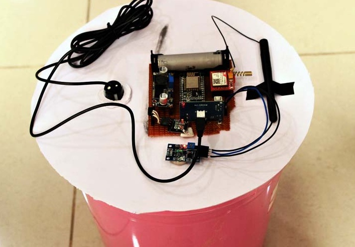 現在一切都準備好了,讓我們測試一下設置。為了進行測試,我在桶里裝滿了水,并用太陽板作為桶的蓋子。然后我將硬件安裝在蓋子上,如下圖所示: