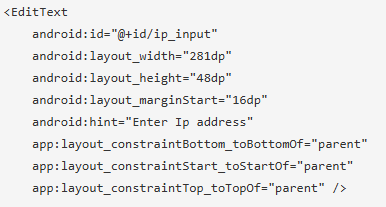 在上面的圖像中,我們有一個EditText,它指示輸入IP地址。下面的代碼可用于在布局中添加EditText。