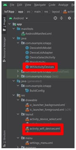 所以我們需要創(chuàng)建一個名為“WifiActivityDevices”的活動。相應(yīng)的布局文件“activity_wifi_devices.xml”文件將使用此活動創(chuàng)建,正如我在上圖中的紅色圓圈中提到的那樣。在我們開始android應(yīng)用程序的編碼部分之前,我們需要在AndroidMenifest.xml文件中添加幾行代碼。我們需要在“構(gòu)建”中添加一個依賴項。gradle”文件。在下面的圖像中,您可以看到我已經(jīng)標記了清單文件和構(gòu)建。Gradle文件帶有紅色方塊。