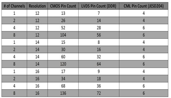 表1 使用帶有不同通道計數(shù)和比特分辨率的80MSP轉(zhuǎn)換器顯示三個不同接口的PIN計數(shù)。在CMOS和LVDS輸出的情況下,數(shù)據(jù)假定每個通道數(shù)據(jù)的同步時鐘,而使用CML輸出的JEDS204數(shù)據(jù)傳輸?shù)淖畲髷?shù)據(jù)速率為3.2Gbps。當看到這個表時,向CML發(fā)展的原因變得顯而易見,而且可以實現(xiàn)的針數(shù)的大幅減少也是顯而易見的。 .