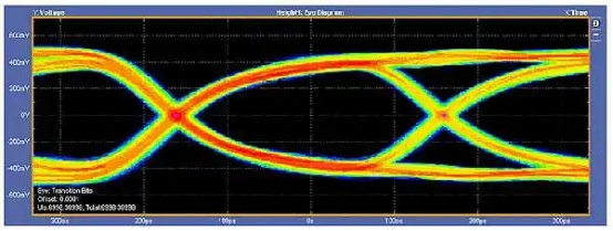圖6顯示了一個不恰當終止的CML驅(qū)動器相同的3.1GbpsJES204鏈接的結(jié)果。眼影圖的顫動次數(shù)增加,幅度減小,眼睛關(guān)閉,導(dǎo)致接收器在解釋數(shù)據(jù)時有困難。