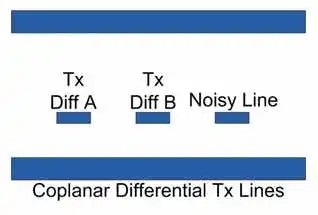 除了有適當?shù)慕K止外,還必須注意輸電線路的物理布局。對于如何設(shè)計差速線有一些普遍的誤解。有人會說共面差動輸電線路(圖8)比寬帶差動輸電線路(圖7)提供更好的性能。然而,這兩種類型的差動輸電線路在噪聲耦合免疫方面都沒有優(yōu)勢。