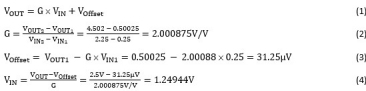 公式1 展示標(biāo)定線性系統(tǒng)時(shí)使用的一般直線方程。 公式2 和 公式3 顯示增益和偏移校正系數(shù)的計(jì)算.注意,增益的理想值是2.0V/V,但由于電阻的公差,測(cè)量值是200088V/V。