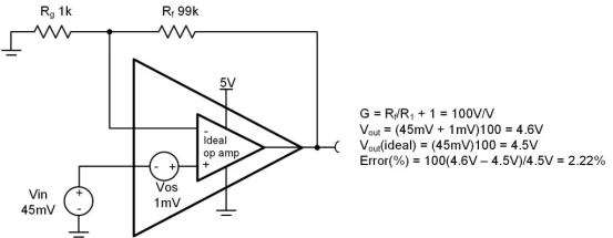 輸入偏移電壓(V O )的運(yùn)算放大器(OPAMP)被建模為直流誤差源,就像電壓源在非逆變輸入上的作用。小輸入信號(hào)對(duì)高增益電路具有顯著的誤差.