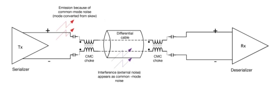 圖3 顯示出這樣一個組件,它能衰減共模信號,從而在傳遞差動信號時減少對內(nèi)偏斜。這個組件被稱為共模阻塞,因為它減弱或"阻塞"信號的共模組件。由于這些共模阻塞需要在非常高的頻率工作,通常這些通常是被動的電濾波器,它在不受阻礙地傳遞差動信號的情況下阻塞共模信號,如圖3所示。公共模式的塞子是非常小的物理尺寸-小到0805,甚至設計為印刷電路板安裝。