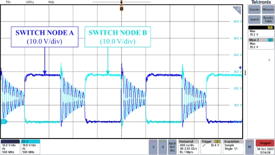 圖2 顯示(從下到上)輸出信號、主橋兩側(cè)的開關(guān)-節(jié)點電壓和主繞組電流。當(dāng)輸出電壓和輸出電壓都很低時,開關(guān)節(jié)點在中斷時間返回到輸入電壓的一半。