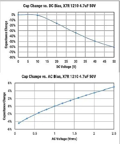 頂部,電容變化比。直流偏置對一個凱梅特XTR2127G50V多功能協(xié)調(diào)器。下面是電容變化。相同設(shè)備的交流偏差。進一步復(fù)雜化的是,并非所有第二類和第三類Mlcc都顯示出與直流電壓相同的電容損耗水平。正如多金屬管公司制造商凱梅特所指出的,在額定電壓下,一些MLCS可能會損失10%的電容,而在額定電壓下,其他具有相同外殼尺寸的MLCS可能會損失70%的電容。原因之一:較高的電壓會導(dǎo)致每個有源層產(chǎn)生較高的電場,使鈦離子難以定位。此外,電容器中的鐵電材料由于各種性能原因可以包括摻雜劑,從而使VCC明顯惡化。此外,不同的MLCS使用的陶瓷電,其厚度可以從10歐氏到1歐氏。層越薄,電場作用越高,VCC效應(yīng)越明顯。
