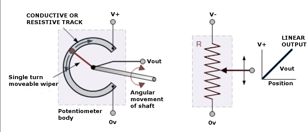 廣泛使用的電位器(罐)是一個接觸位置傳感器,使用雨刷接觸器,連接到移動部分,沿電阻軌道移動。輸出量會隨雨刷在軌道上的位置而變化,所以電阻與位置成正比。通過使軌道設(shè)計彎曲,罐可以用于旋轉(zhuǎn)和線性測量。