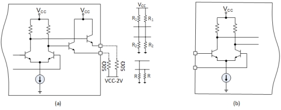 圖5 (a)CML輸出級由具有16MA開關電流和對VCC的50分集電阻的一對共混發(fā)射晶體管和一個(b)CML輸入級由驅動差動對的普通發(fā)射對組成。