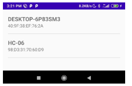 正如你在上圖中看到的,我們有一個菜單部分,有兩個項目“藍牙”和“退出”。在藍牙中,我們需要添加可以顯示配對設備的功能,我們可以通過簡單的點擊連接任何配對設備。在下圖中,您可以發(fā)現(xiàn)它正在顯示配對的設備。就我而言,我已經(jīng)將它與HC-06藍牙模塊和我的Desktop配對。