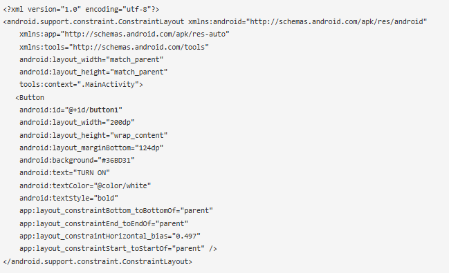 在上面的代碼片段中,我使用了Button類,并給了它一個唯一的Id,即“Button1”。我使用“android:text”在按鈕上添加文本,該按鈕最初設(shè)置為“TURN on”,每當(dāng)用戶按下按鈕時,我們將從MainActivity.java文件更改此文本。