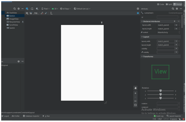 Design部分將為您提供拖放功能,以便在布局中添加任何項。在下圖中,你可以看到我們只有設(shè)計窗口,它允許我們拖放組件,我們可以通過使用布局窗口旁邊給出的屬性窗口來改變組件的屬性。