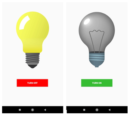 我們將遵循簡單的Android架構(gòu),我們需要創(chuàng)建一些活動和布局,我們需要為特定的活動設(shè)計布局。困惑吧?你可以訪問這個鏈接了解更多關(guān)于Android工作流程、模型和架構(gòu)的細節(jié)。在本教程中,我們的主要重點是為Wi-Fi和藍牙應(yīng)用程序創(chuàng)建一個Android應(yīng)用程序。因此,我將本教程分為兩個部分。在第一部分中,我將向您展示如何在Android Studio中制作您的第一個Android應(yīng)用程序,我們將添加一個按鈕和兩個燈泡圖像(用于打開和關(guān)閉狀態(tài))。然后我們將改變按鈕和圖像的狀態(tài)為ON或OFF每當(dāng)我們點擊按鈕。因此,在本教程結(jié)束時,您將學(xué)習(xí)如何構(gòu)建一個簡單的Android應(yīng)用程序,其中包含一個按鈕來控制燈泡,如下所示。