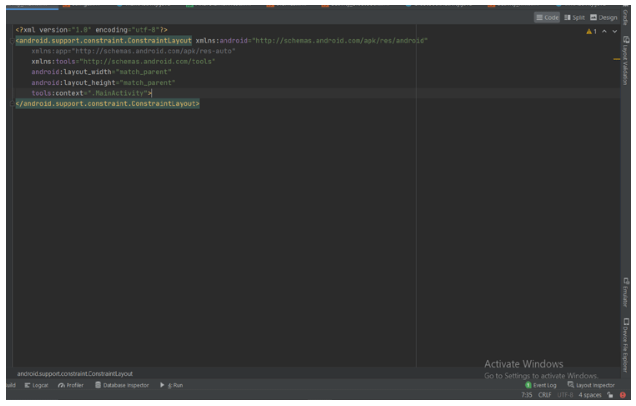 代碼部分將允許您使用編碼制作整個布局。在下面的圖像中,您可以看到activity_main.xml文件的代碼部分。編輯窗口內(nèi)的以下代碼已自動生成。默認布局組件是約束布局。您可以將布局更改為其他布局,如相對布局,線性布局等。