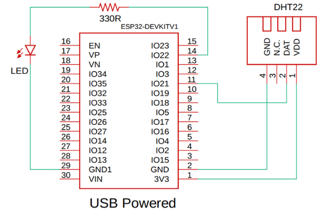 正如你在上圖中所看到的,這個(gè)項(xiàng)目的大腦是ESP32開發(fā)板。電路如下。我們已經(jīng)將LED連接到ESP32的引腳22。我們還將DHT22溫濕度傳感器與ESP32的引腳21連接。為了測(cè)試電路,我們將從USB供電。