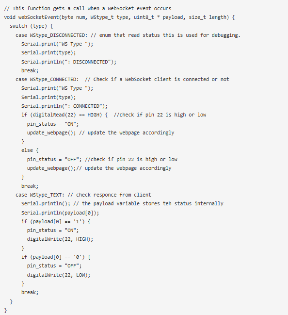 接下來我們有webSocketEvent()函數(shù)。這個(gè)函數(shù)在WebSocket事件發(fā)生時(shí)被調(diào)用。在本節(jié)中,我們將檢查狀態(tài)并打印連接的客戶端數(shù)量。接下來,我們檢查客戶端是否通過WebSocket連接。如果是,我們?cè)诰W(wǎng)頁上更新狀態(tài)。接下來,我們檢查web服務(wù)器是否向我們發(fā)送了任何數(shù)據(jù)作為響應(yīng)。如果是,我們處理它,并根據(jù)狀態(tài);我們打開或關(guān)閉附加的LED。