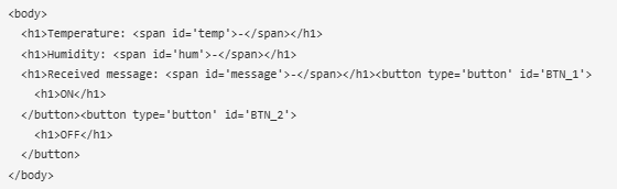 接下來,在<\body>標(biāo)簽中,我們使用。在這些標(biāo)題中,我們將顯示來自DHT22傳感器的溫度和濕度數(shù)據(jù),我們也將能夠在本節(jié)中看到LED的狀態(tài)。為了打開和關(guān)閉LED,我們?cè)黾恿藘蓚€(gè)按鈕,一個(gè)命名為開,另一個(gè)命名為關(guān)。