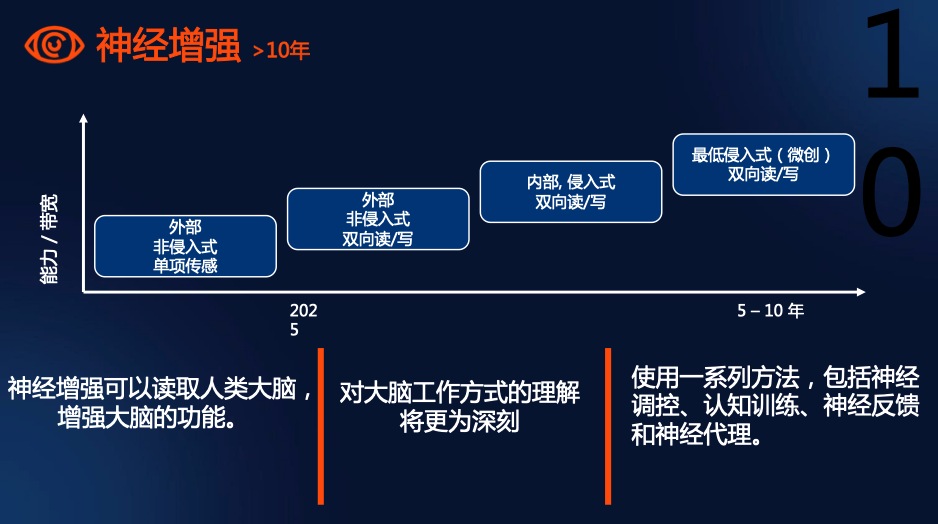 神經(jīng)增強(qiáng)主要是指腦機(jī)接口技術(shù),通過(guò)讀取和解碼大腦活動(dòng)來(lái)提高人類認(rèn)知能力。馬斯克的Neuralink在2023年5月獲得了FDA批準(zhǔn),進(jìn)行可植入芯片的人體實(shí)驗(yàn),2024年已有患者接受了手術(shù)。神經(jīng)增強(qiáng)的發(fā)展路徑是從非侵入式的單向傳導(dǎo)到雙向讀寫,再到侵入式的雙向讀寫,最終實(shí)現(xiàn)微創(chuàng)的雙向讀寫。