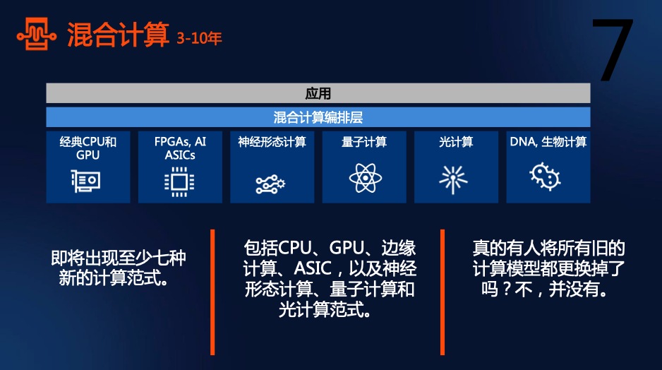 高挺指出,傳統(tǒng)計(jì)算的未來(lái)不是量子計(jì)算,而是混合型的計(jì)算。混合計(jì)算不是單純依賴傳統(tǒng)計(jì)算或量子計(jì)算,而是結(jié)合不同計(jì)算存儲(chǔ)和網(wǎng)絡(luò)基礎(chǔ)設(shè)施來(lái)解決問(wèn)題。通過(guò)結(jié)合神經(jīng)形態(tài)計(jì)算、量子計(jì)算、光計(jì)算和生物計(jì)算等技術(shù),以發(fā)揮各自的優(yōu)勢(shì)。例如光計(jì)算可能在解決某些復(fù)雜的優(yōu)化問(wèn)題上具有優(yōu)勢(shì),而量子計(jì)算在藥物發(fā)現(xiàn)和材料科學(xué)領(lǐng)域表現(xiàn)出了獨(dú)特的能力?;旌嫌?jì)算的最終目標(biāo)是通過(guò)編排系統(tǒng)將不同的計(jì)算范式整合起來(lái),為復(fù)雜問(wèn)題提供最佳解決方案。
