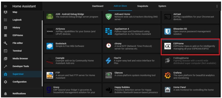 通過ESPHome家庭助理插件安裝ESPHome非常簡單。要安裝ESPHome,首先,導(dǎo)航到Home Assistant Web UI,從那里導(dǎo)航到Supervisor面板,然后在“Add-on Store”選項(xiàng)卡中搜索ESPHome。