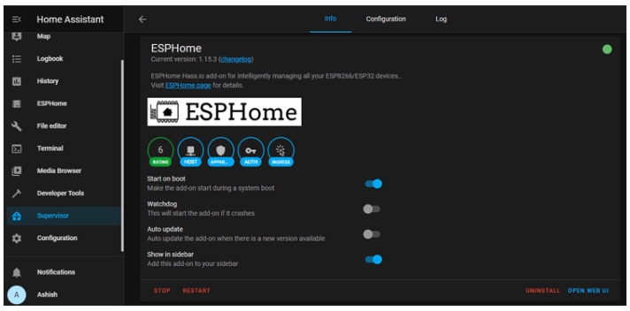 打開ESPHome,然后簡單地點(diǎn)擊安裝按鈕來安裝它。之后,等待加載項(xiàng)安裝完成。然后啟動(dòng)附加組件并打開“在側(cè)邊欄中顯示”選項(xiàng)以方便訪問。之后,點(diǎn)擊“打開Web UI”。