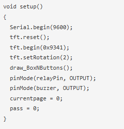 在setup()函數(shù)中,為調(diào)試目的將串行監(jiān)視器初始化為9600波特率,并初始化TFT顯示。然后定義繼電器和蜂鳴器引腳作為輸出引腳。