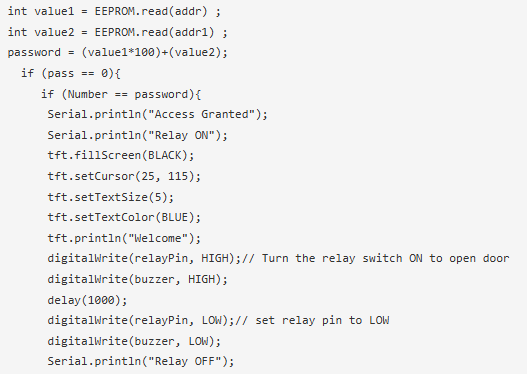 第三部分是檢查用戶輸入的密碼和控制大門。由于默認(rèn)密碼存儲在Arduino的EEPROM中,所以首先,我們將從EEPROM讀取密碼,然后將其與用戶輸入的密碼進(jìn)行比較。密碼存儲在兩個不同的地址,因為Arduino Uno EEPROM只能在一個地址存儲0-255個數(shù)字。