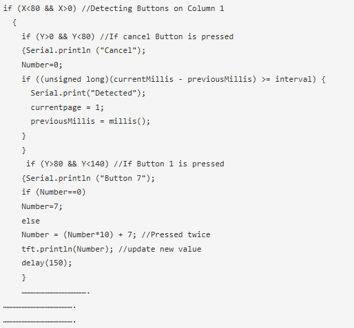 現(xiàn)在,在創(chuàng)建UI之后,第二部分包括檢測每個按鈕的用戶觸摸,然后執(zhí)行與該按鈕相關(guān)的任務(wù)。每次用戶觸摸屏幕,我們就能知道他/她觸摸的像素的X和Y位置。該值可以顯示在串行監(jiān)視器上,如下所示。